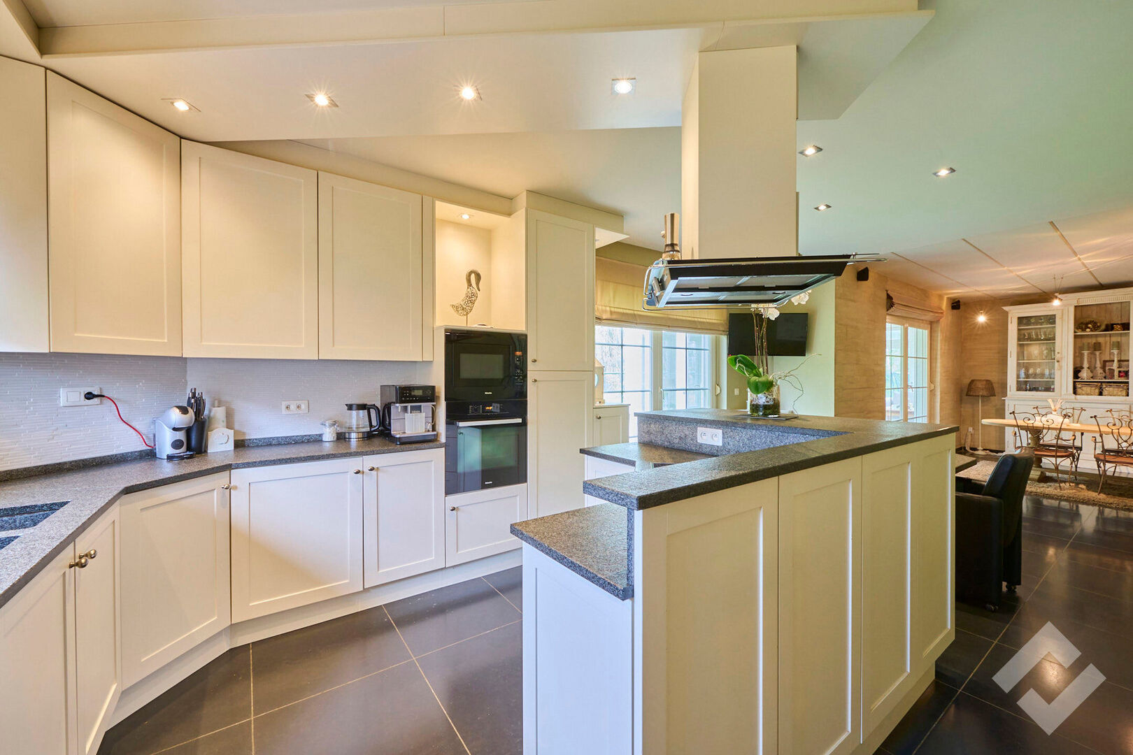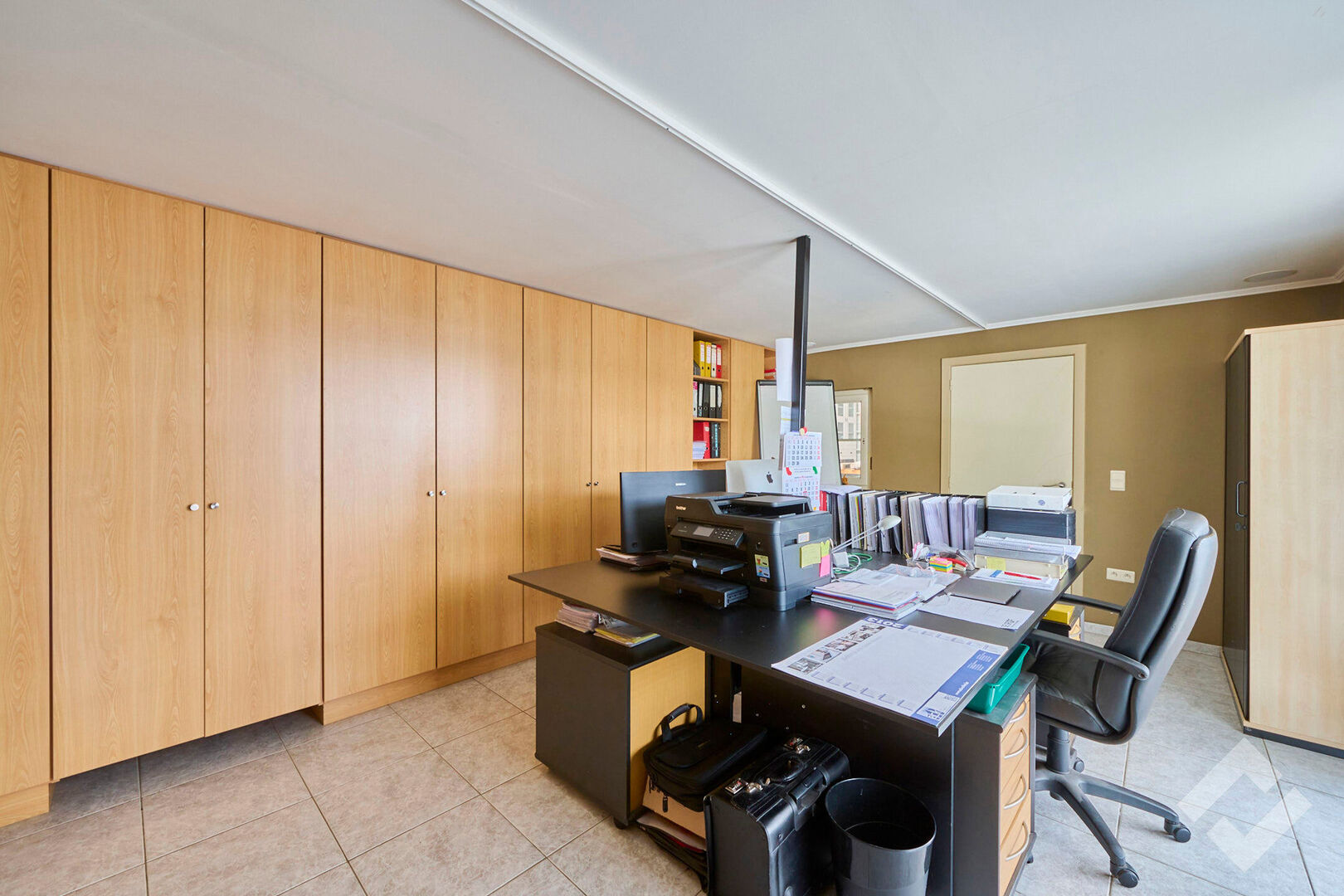 Via de aparte oprit links naast het gebouw kunnen we de woning (300m2) bereiken. Deze woning beschikt over ruime en smaakvol afgewerkte kamers en een grote garage. Betreden doen we via de zij-ingang/traphal. Deze geeft uit in de gezellige woonkamer met zithoek en volledig geïnstalleerde open keuken. Hierbij is er ook doorgang naar de lichtrijke veranda die uitkijkt op groen. Op de eerste verdieping vinden we drie slaapkamers terug, de badkamer, bureau en een grote extra kamer die kan dienen als slaapkamer met dressing. De kantoren vinden we terug op de eerste verdieping via de hal, tevens is er ook een grote kelder aanwezig.