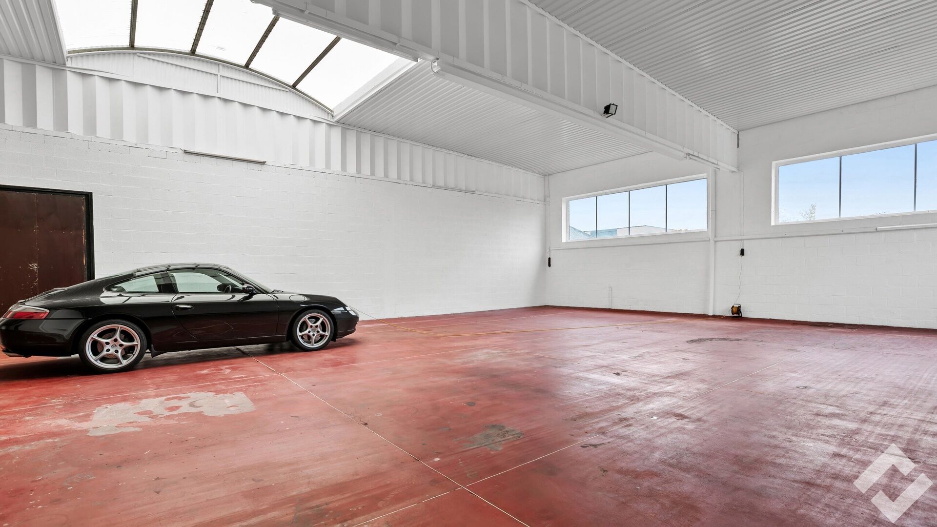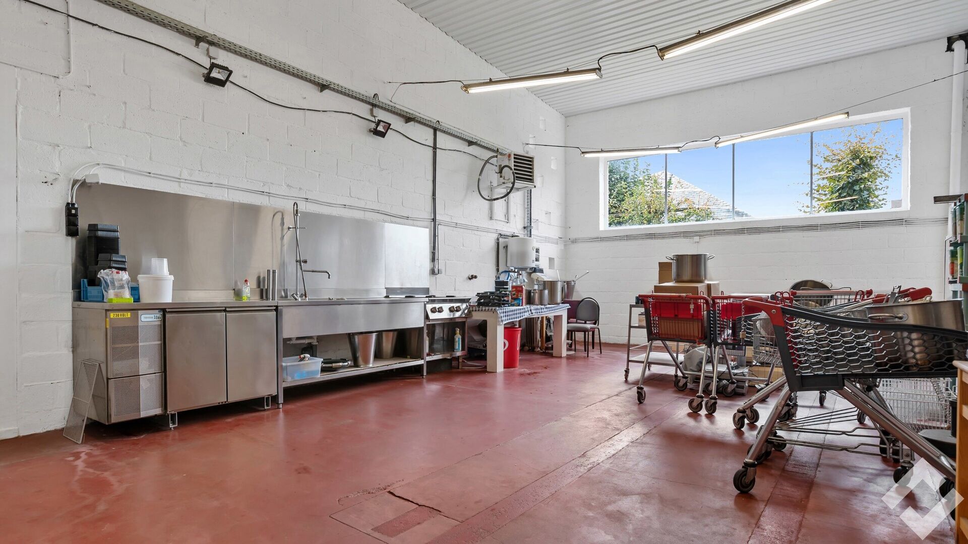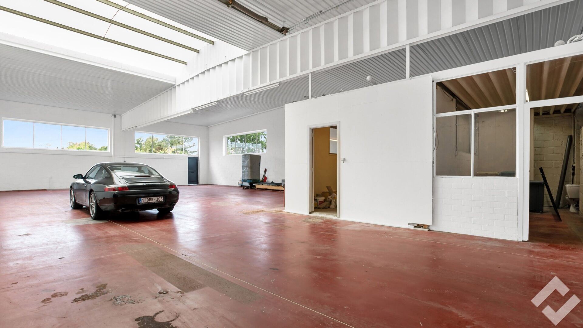 Achteraan vinden we de opslag/werkplaats terug (490m2). Deze heeft voorzieningen zoals een polybetonvloer, twee automatische sectionaalpoorten, stroompunten en drijfkracht, lichtstraat in het dak, edm. Momenteel zijn deze hallen gecompartimenteerd in twee ruimtes met beiden een eigen toegangspoort. Uitzonderlijk is dat deze hallen rondom voorzien zijn van ramen, zo is er steeds veel natuurlijke lichtinval. Aan de zijkant en achterkant is er nog buitenruimte vrij voor eventuele buitenopslag van goederen of containers.