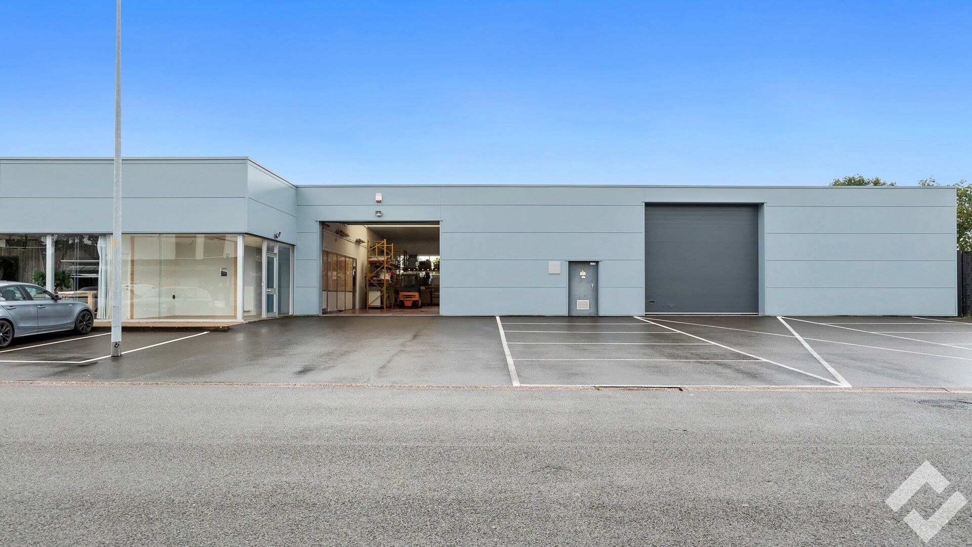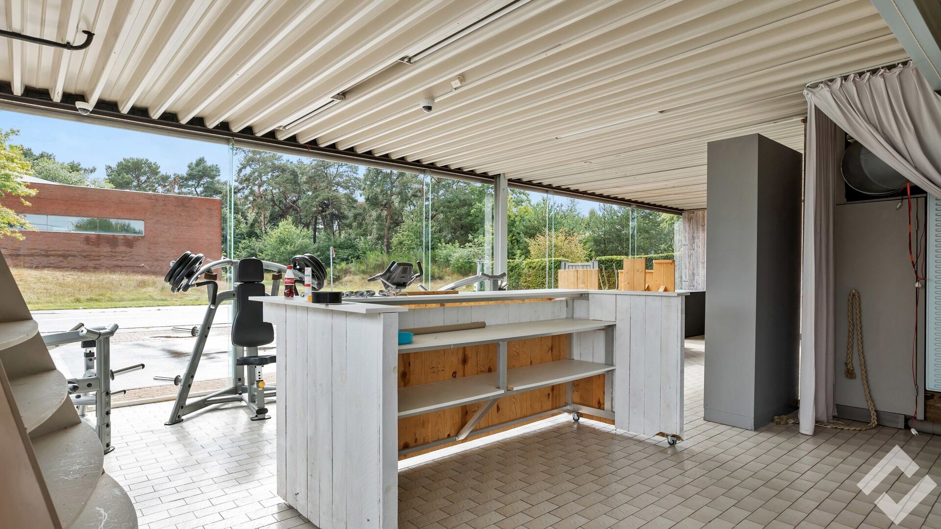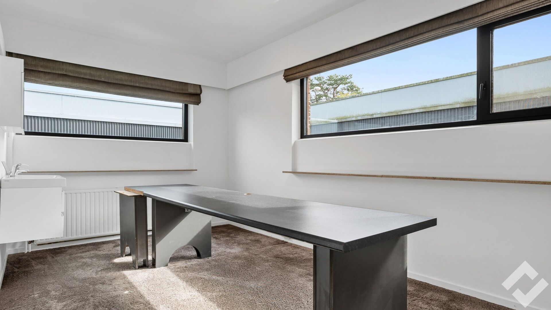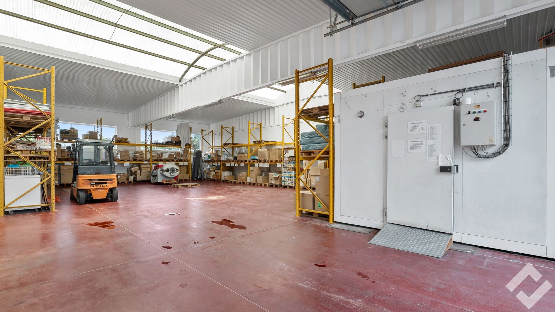Achteraan vinden we de opslag/werkplaats terug (490m2). Deze heeft voorzieningen zoals een polybetonvloer, twee automatische sectionaalpoorten, stroompunten en drijfkracht, lichtstraat in het dak, edm. Momenteel zijn deze hallen gecompartimenteerd in twee ruimtes met beiden een eigen toegangspoort. Uitzonderlijk is dat deze hallen rondom voorzien zijn van ramen, zo is er steeds veel natuurlijke lichtinval. Aan de zijkant en achterkant is er nog buitenruimte vrij voor eventuele buitenopslag van goederen of containers.