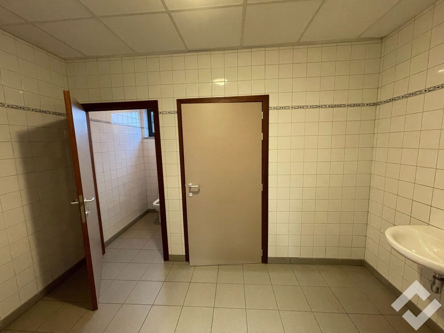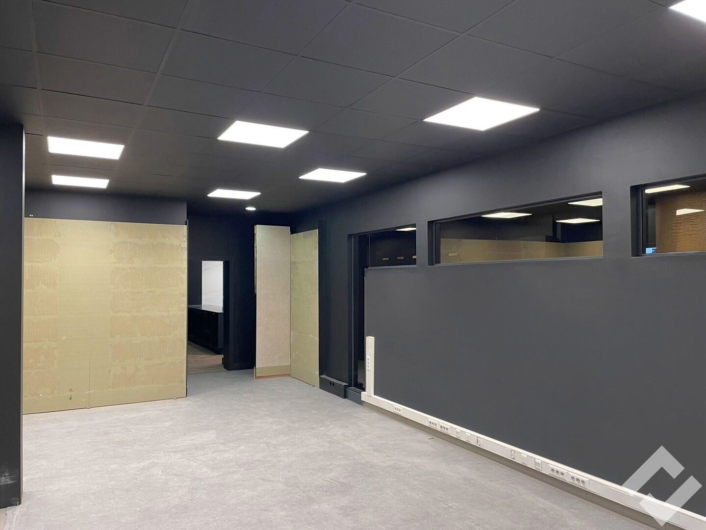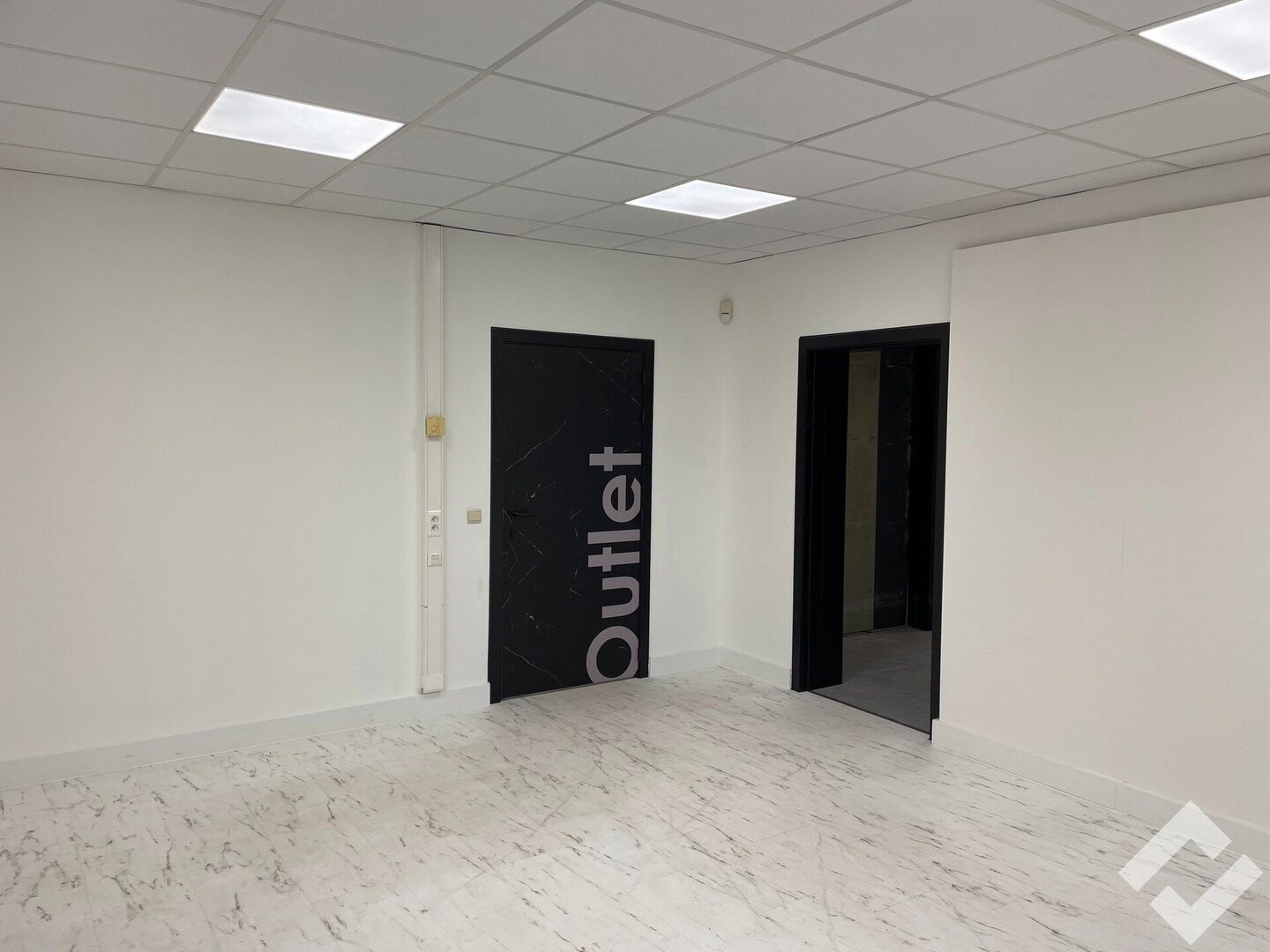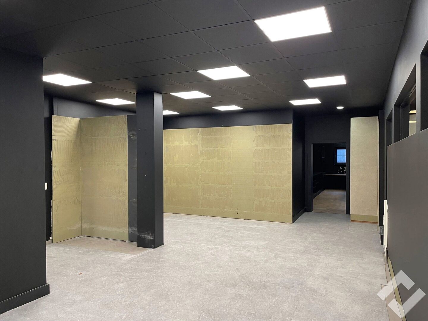 commerciële ruimte, afgesloten ruimte 1, afgesloten ruimte 2, zij-ingang, magazijn, kitchenette, toiletten, kelder.