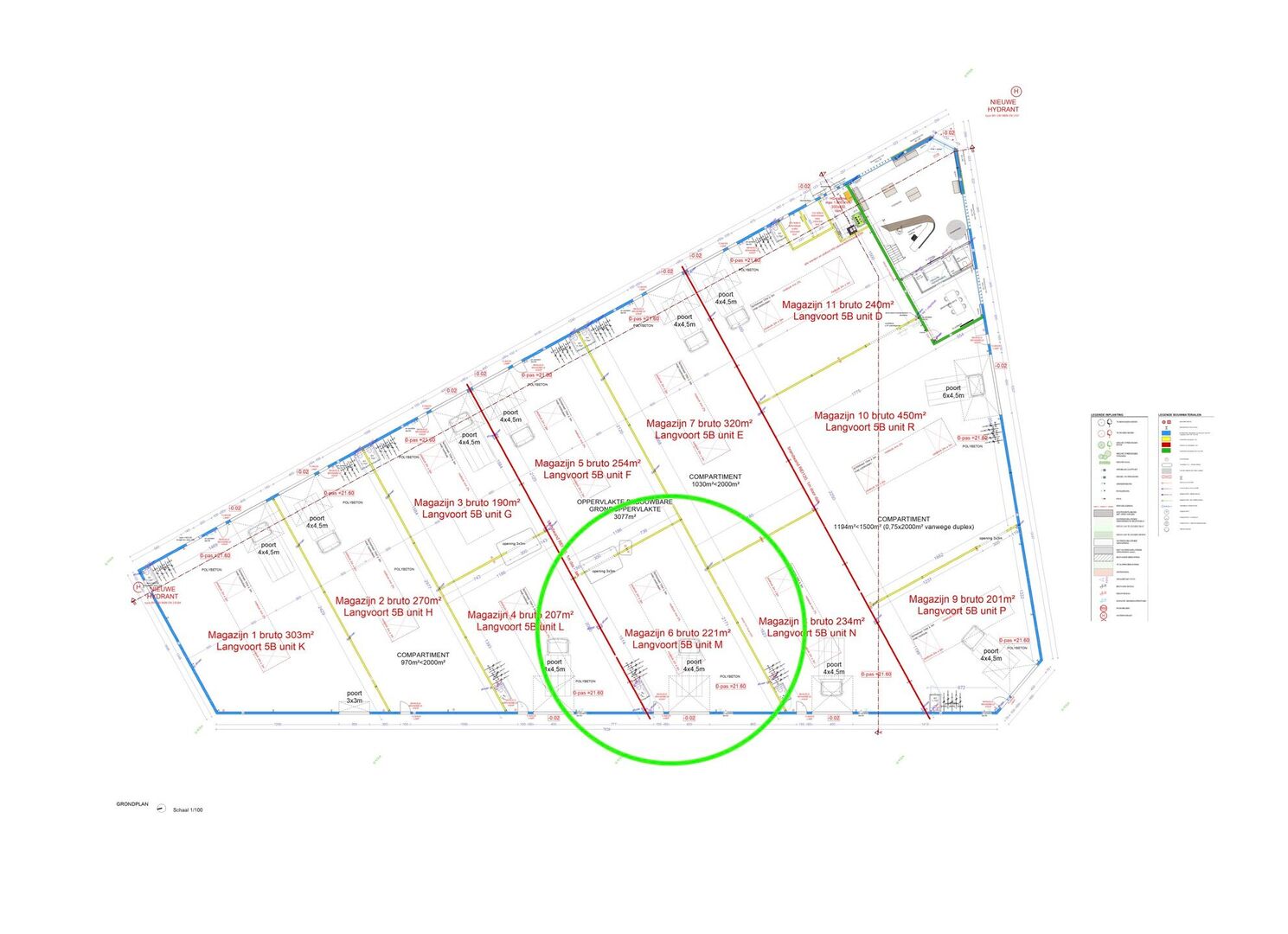 De unit heeft een vloeroppervlakte van 221m2 en dakrandhoogte van 7m. Deze is opgetrokken in staalconstructie met duurzame en onderhoudsvriendelijke materialen. Er zijn voorzieningen zoals industriële betonvloer, automatische sectionaalpoort (4,5m x 4m), lichtstraat met RWA-koepel en brandalarm, toilet en regenwaterput. Nutsvoorzieningen zijn aangesloten, verlichting en stroompunten worden in samenspraak met verhuurder voorzien. Er zijn eveneens twee privatieve parkeerplaatsen inbegrepen.
