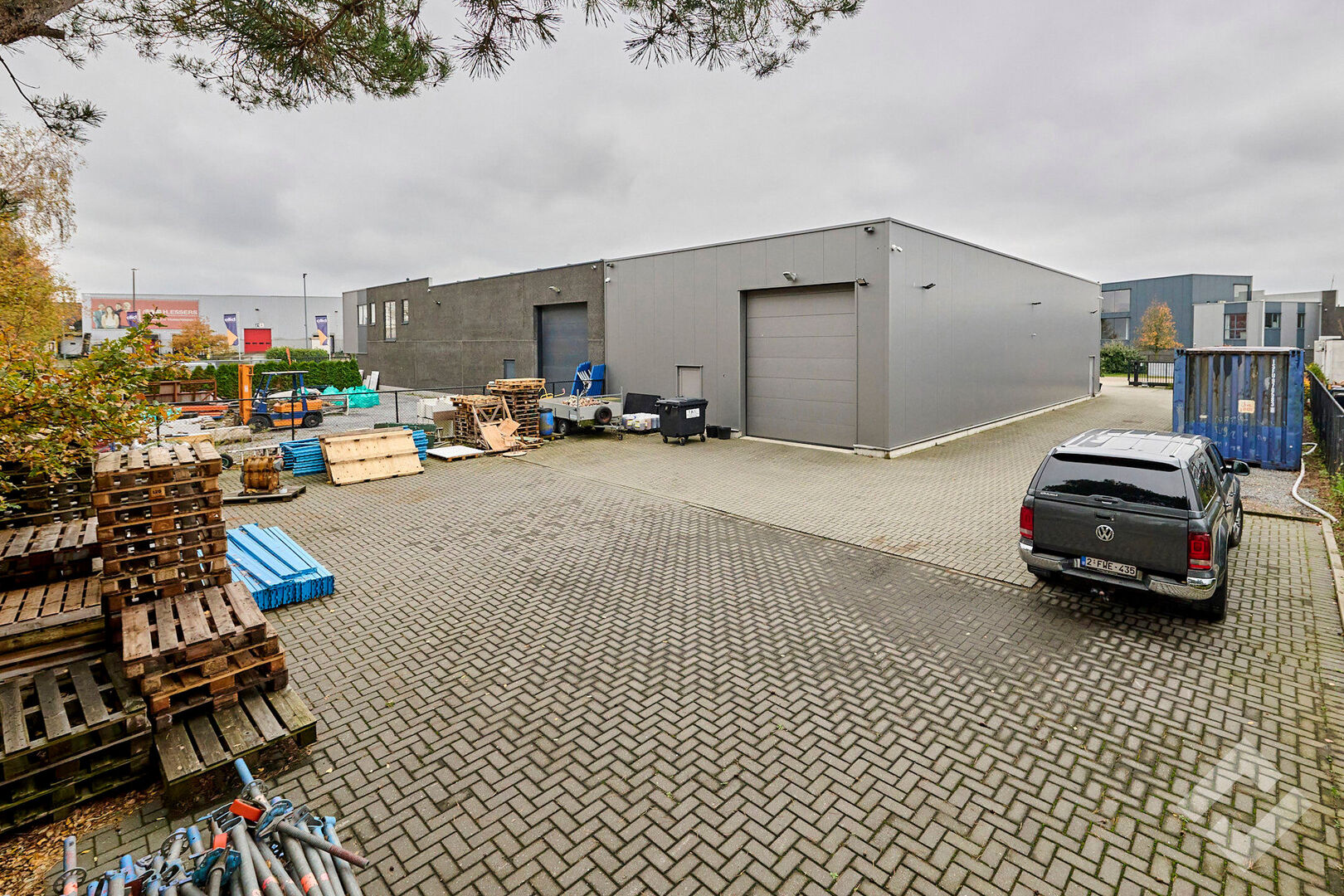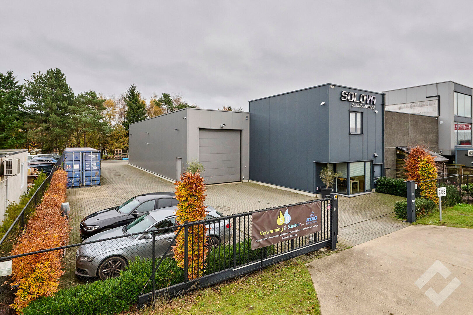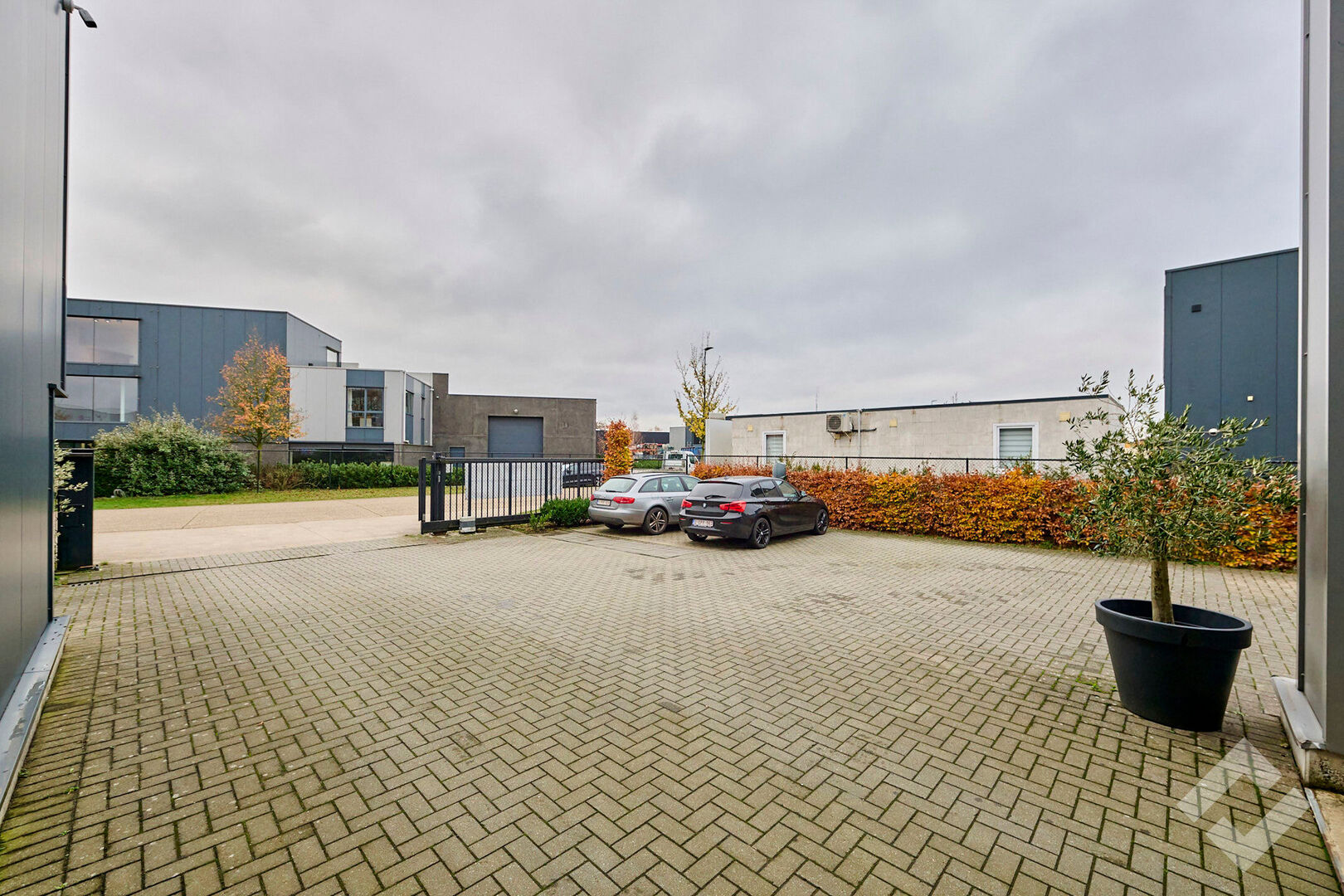 Het perceel is voorzien van laadpalen voor elektrische wagens en biedt voldoende parkeergelegenheid voor zowel personeel als bezoekers. De veiligheid wordt gegarandeerd door de omheining en automatische schuifpoort.