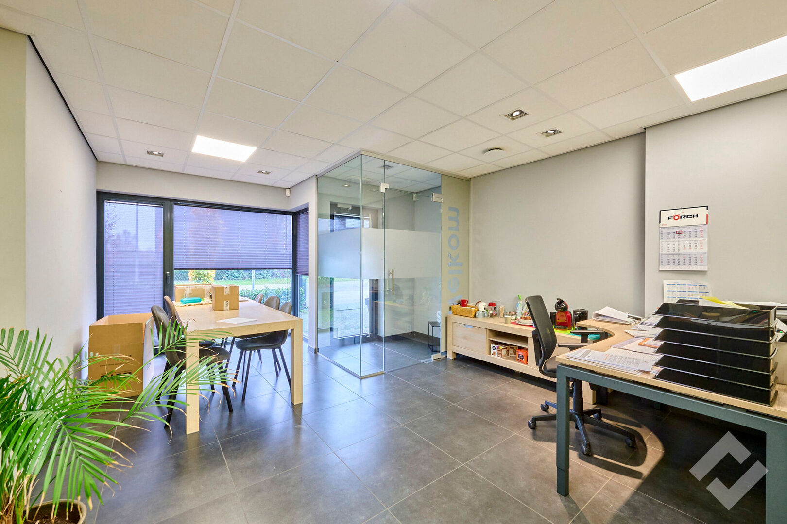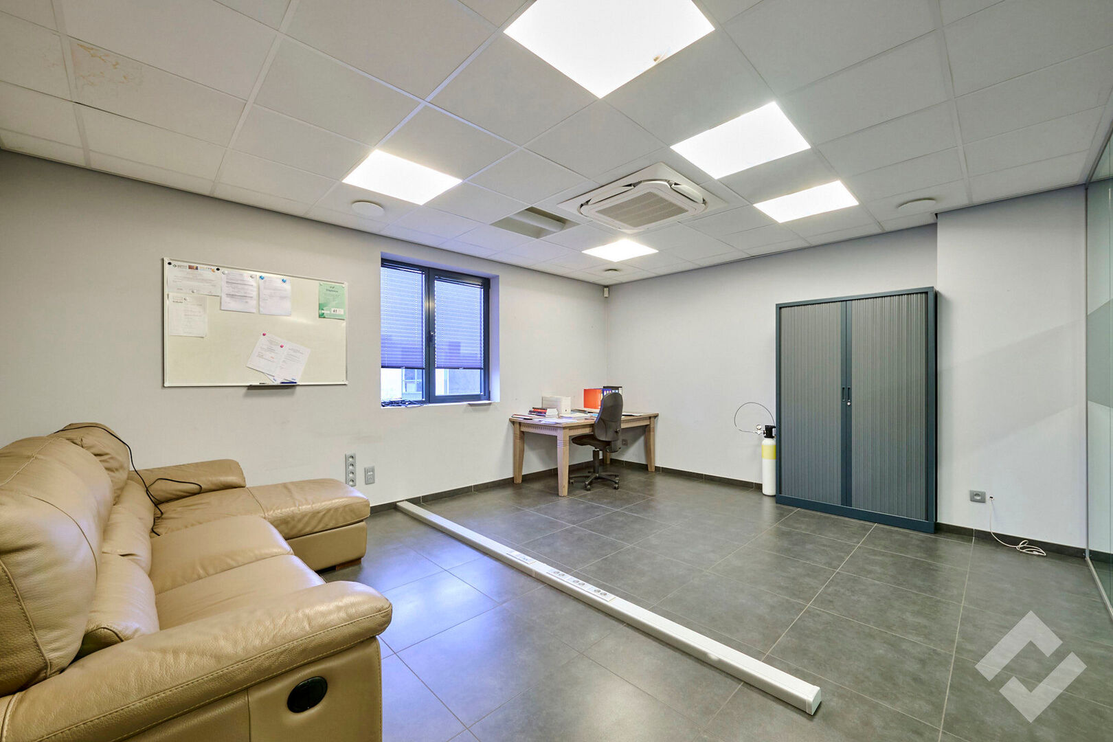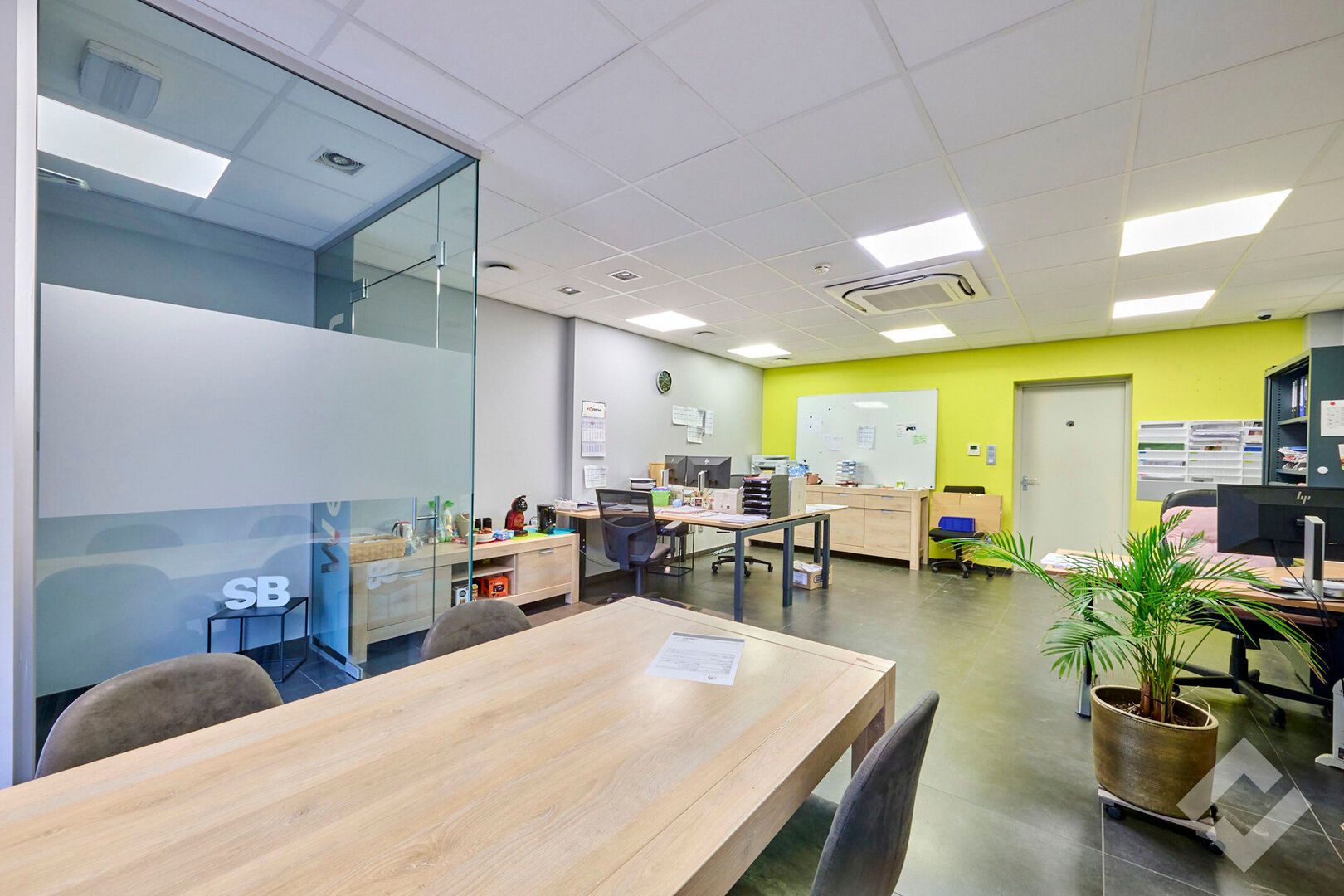 Zowel op de gelijkvloerse als eerste verdieping is er 50m2 aan kantoor en personeelsvoorziening. De benedenverdieping leent zich perfect als ontvangstruimte door zijn open indeling en comfort. Er is centrale verwarming, airco, voldoende stroom en datapunten en automatische screens. Op de eerste verdieping is een groot kantoor met ook alle comfort en werkvoorzieningen evenals een lunchroom met keuken.