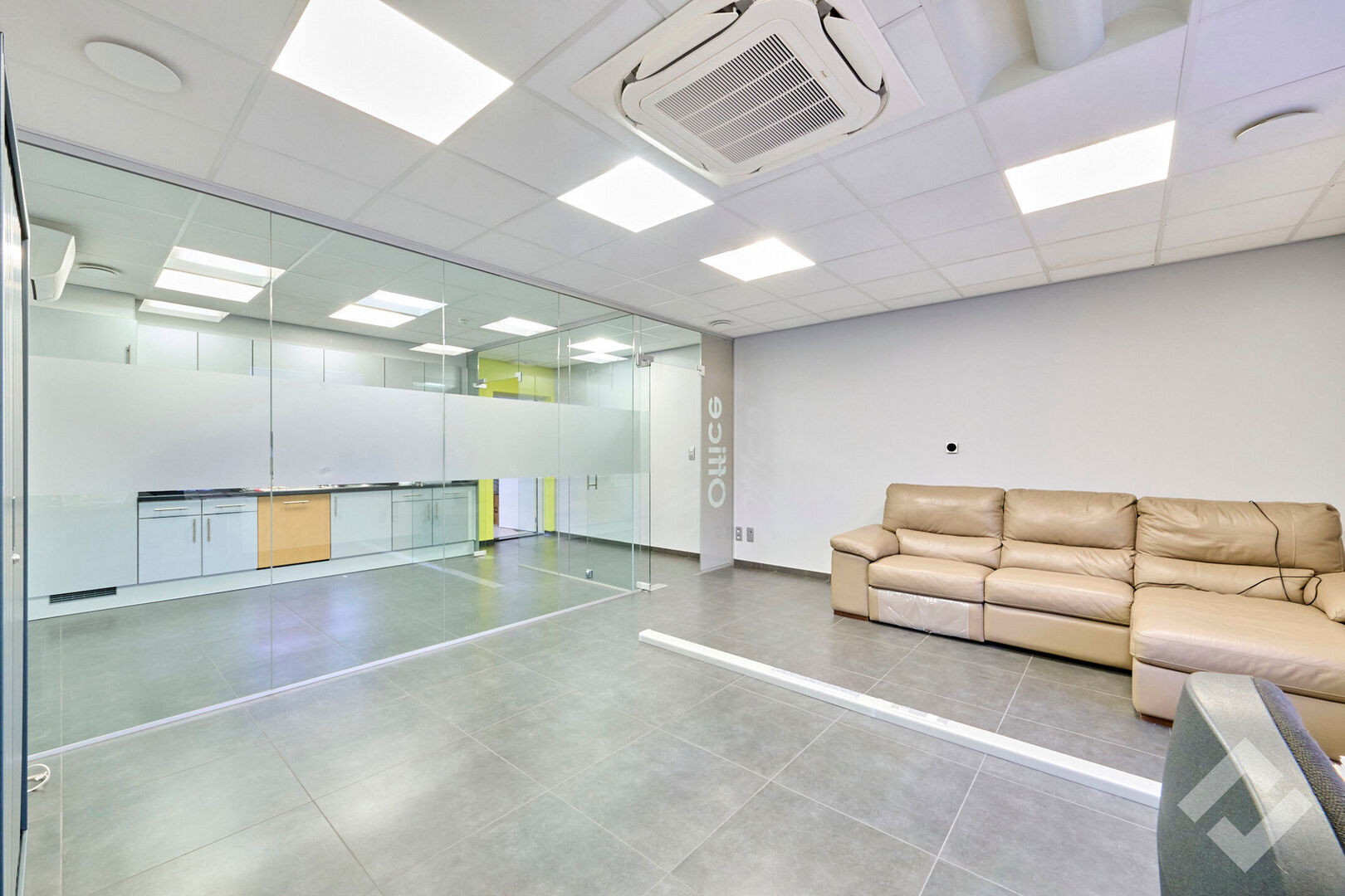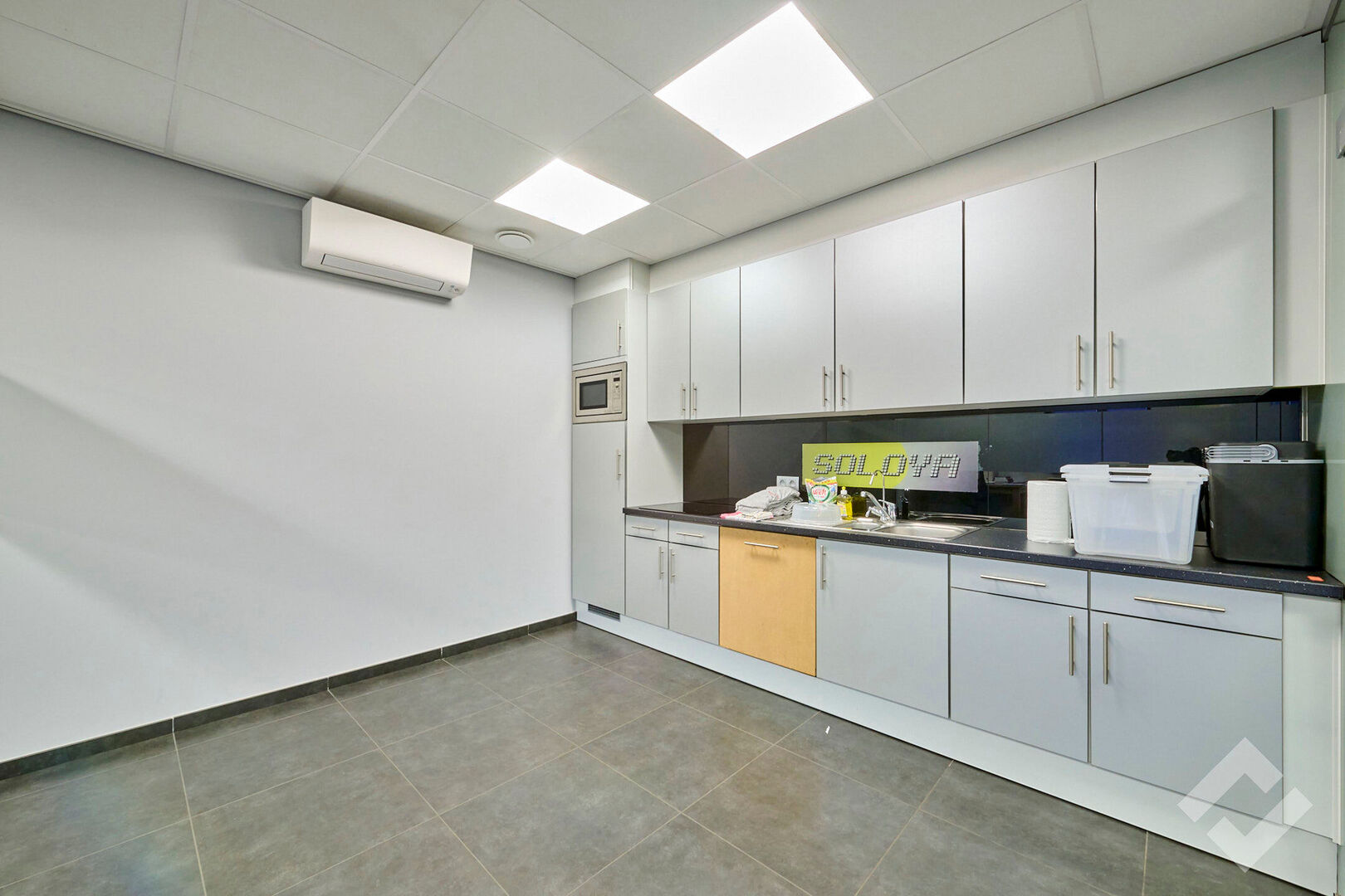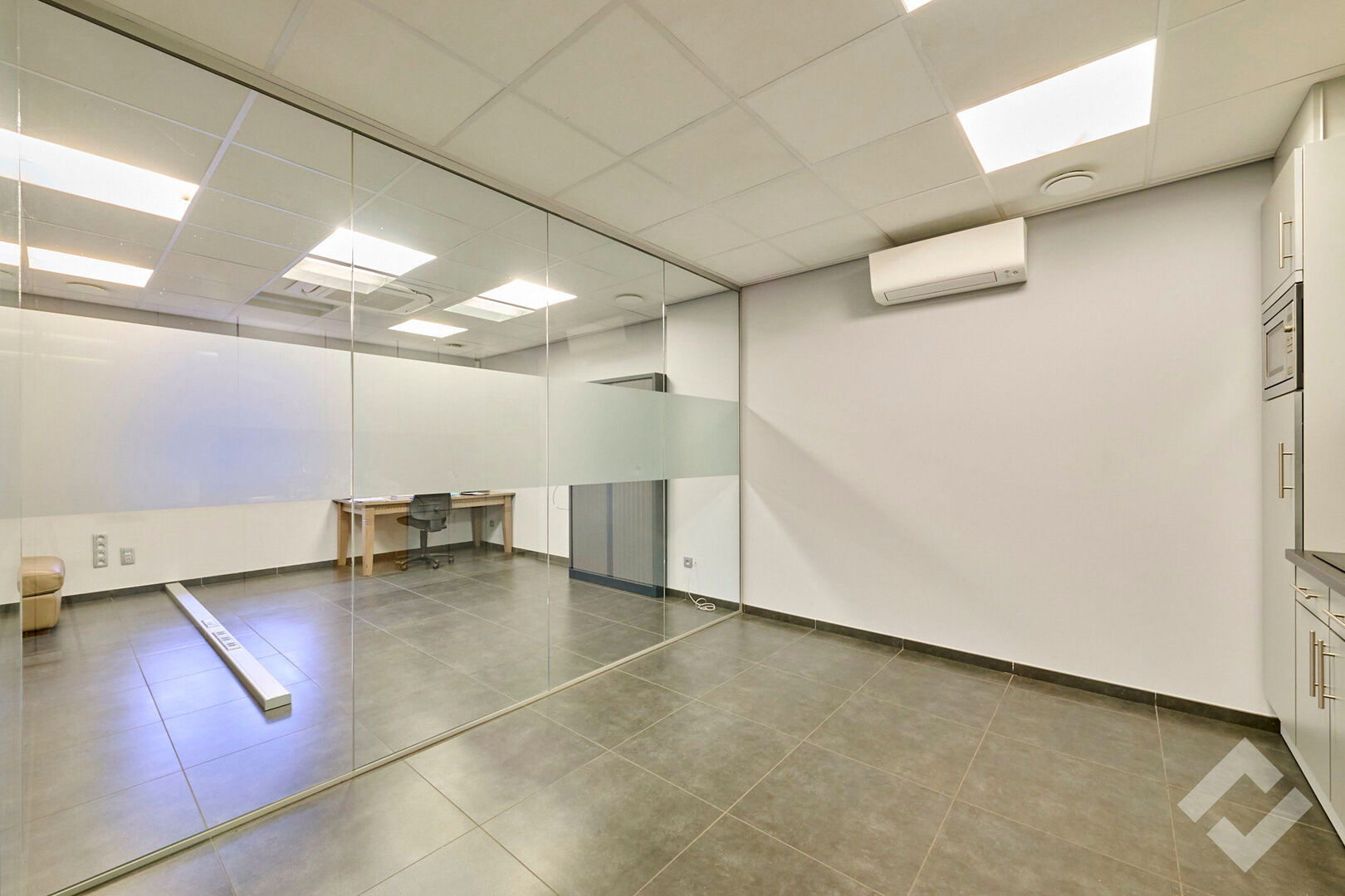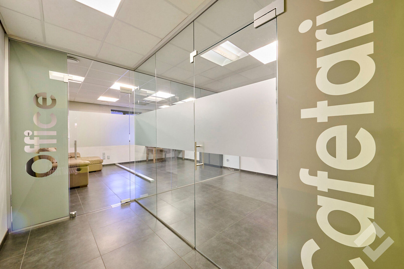 Zowel op de gelijkvloerse als eerste verdieping is er 50m2 aan kantoor en personeelsvoorziening. De benedenverdieping leent zich perfect als ontvangstruimte door zijn open indeling en comfort. Er is centrale verwarming, airco, voldoende stroom en datapunten en automatische screens. Op de eerste verdieping is een groot kantoor met ook alle comfort en werkvoorzieningen evenals een lunchroom met keuken.