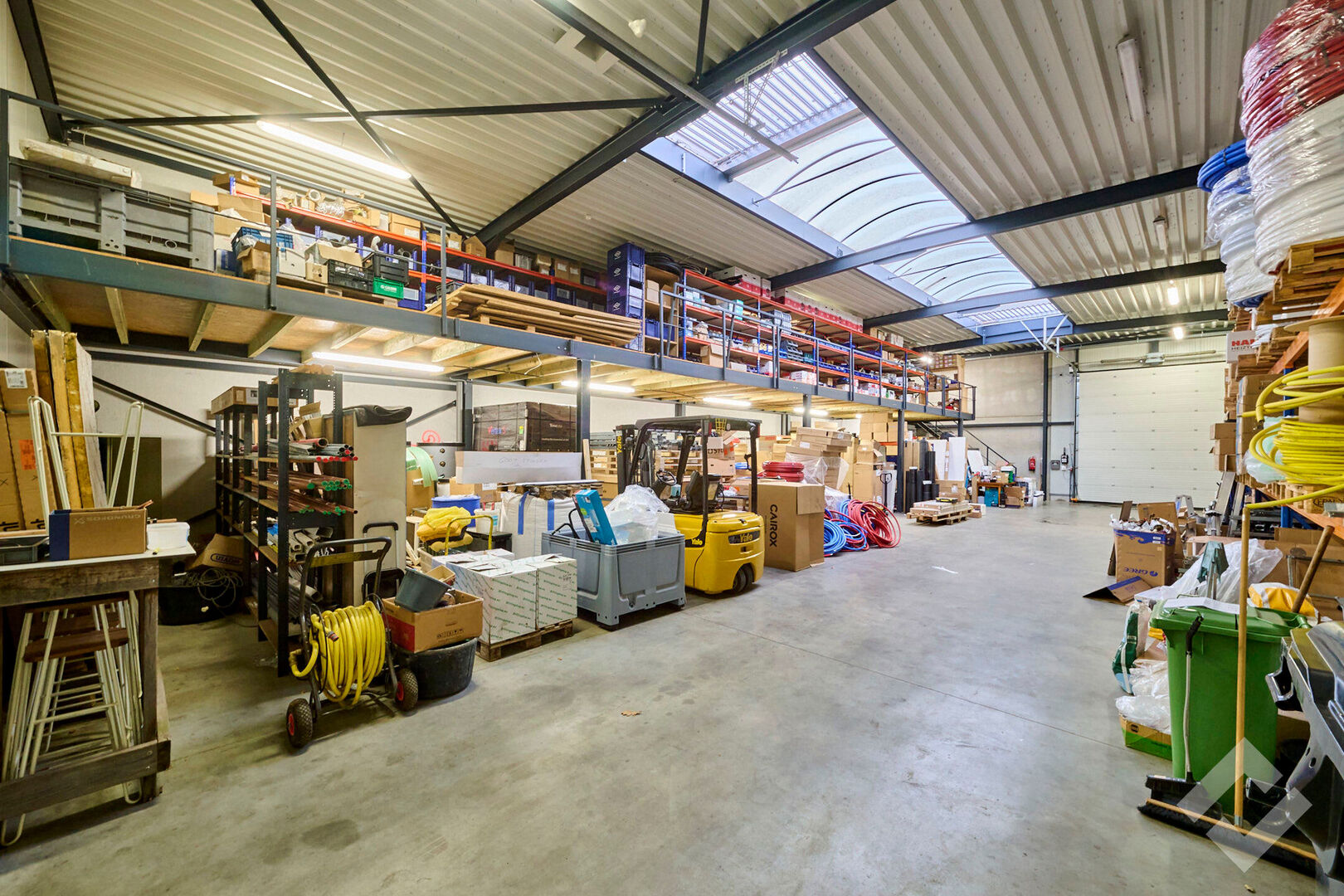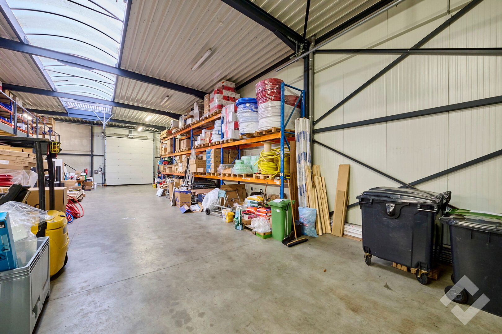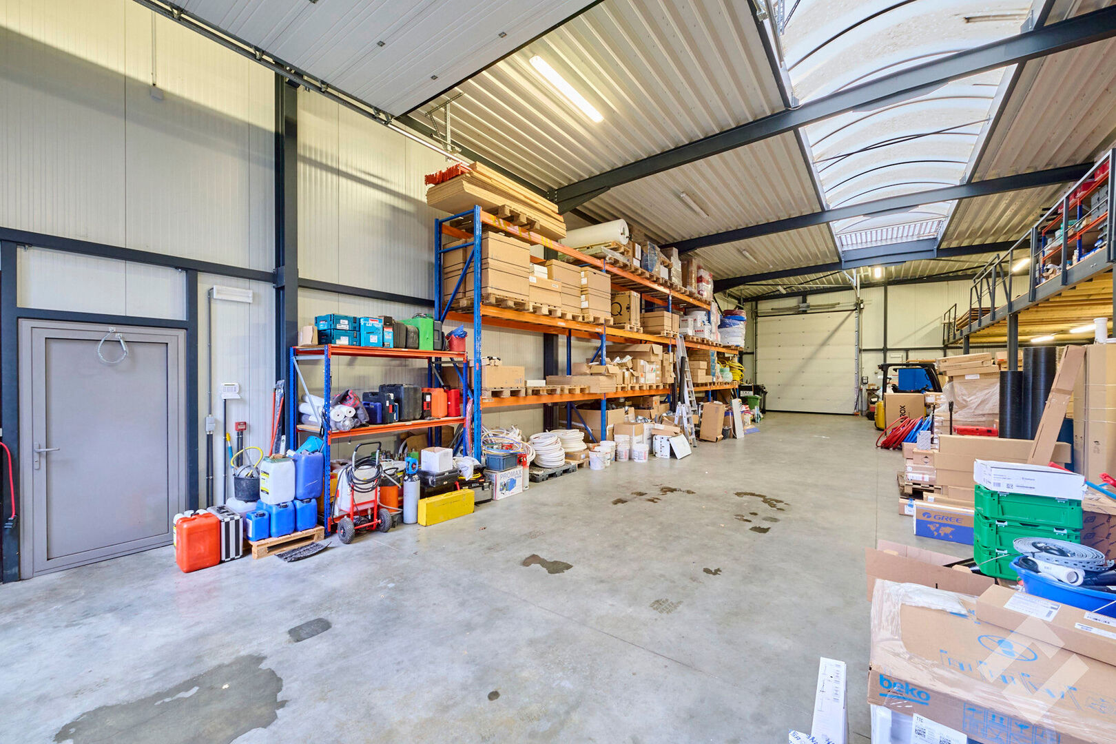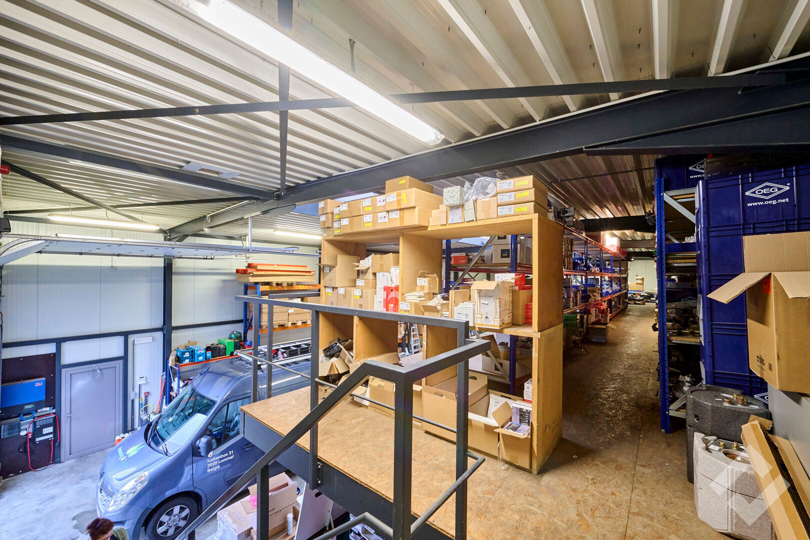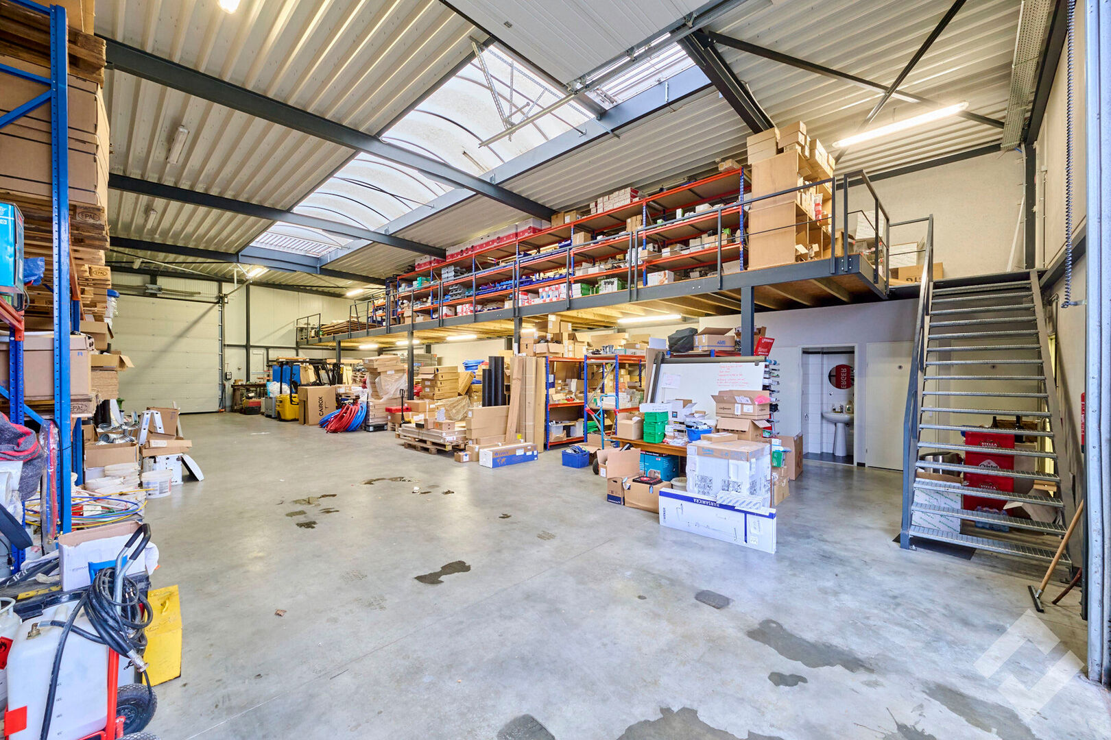 Het magazijn bestaat uit staalconstructie en een vloeroppervlakte van 275m2 en is voorzien van een industriƫle betonvloer, twee automatische sectionaalpoorten (4,5m x 4m), voldoende stroompunten 220V/380V, lichtstraat en verlichting. Verder zijn er enkele praktische toevoegingen zoals verdiepingsvloer, zonnepanelen op het dak en buitenruimte achteraan die langs een zij-oprit te bereiken is.